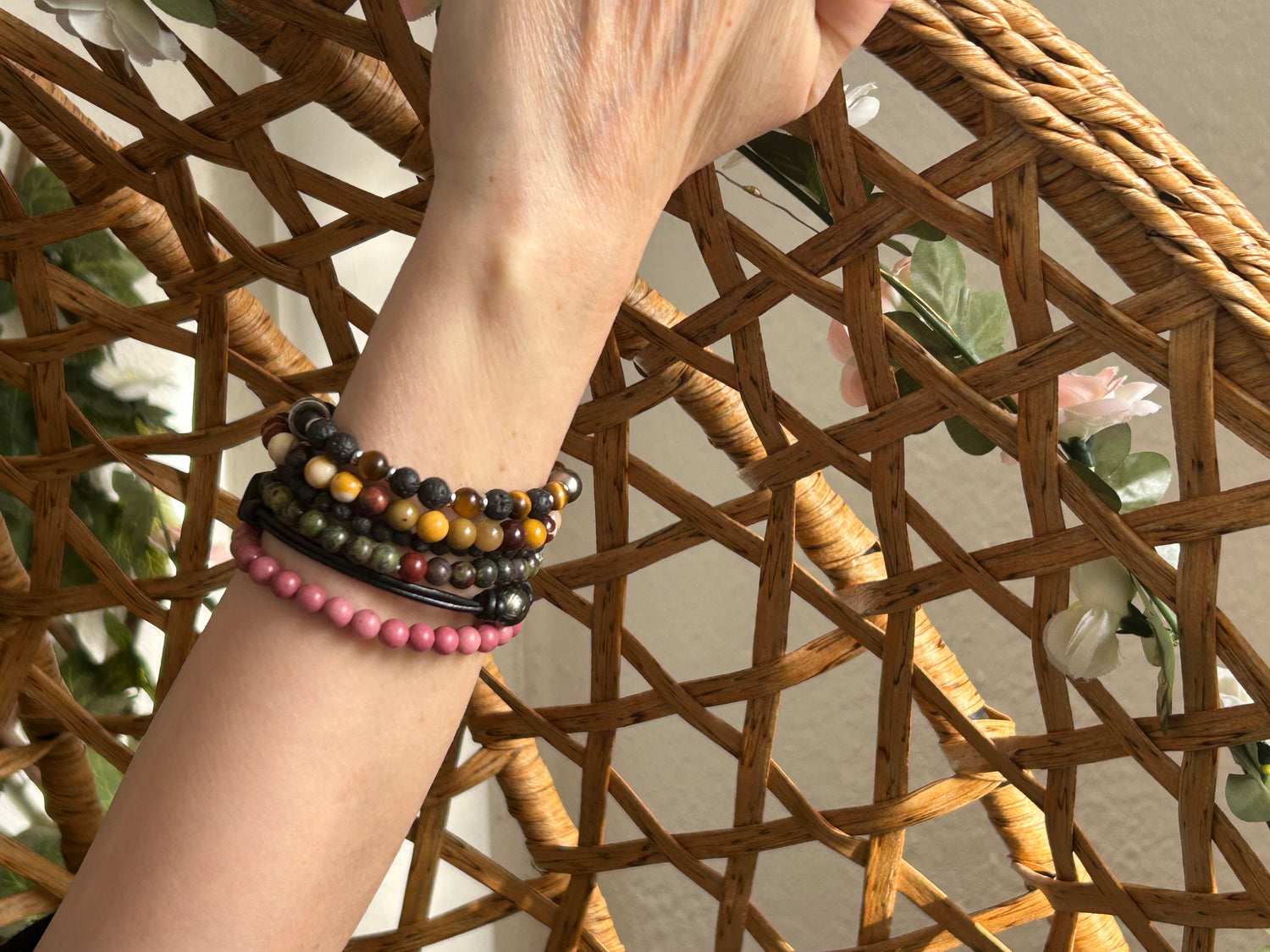 Laissez parler votre style avec cette composition de bracelets en pierrenaturelles, délicatement superposés autour du poignet.